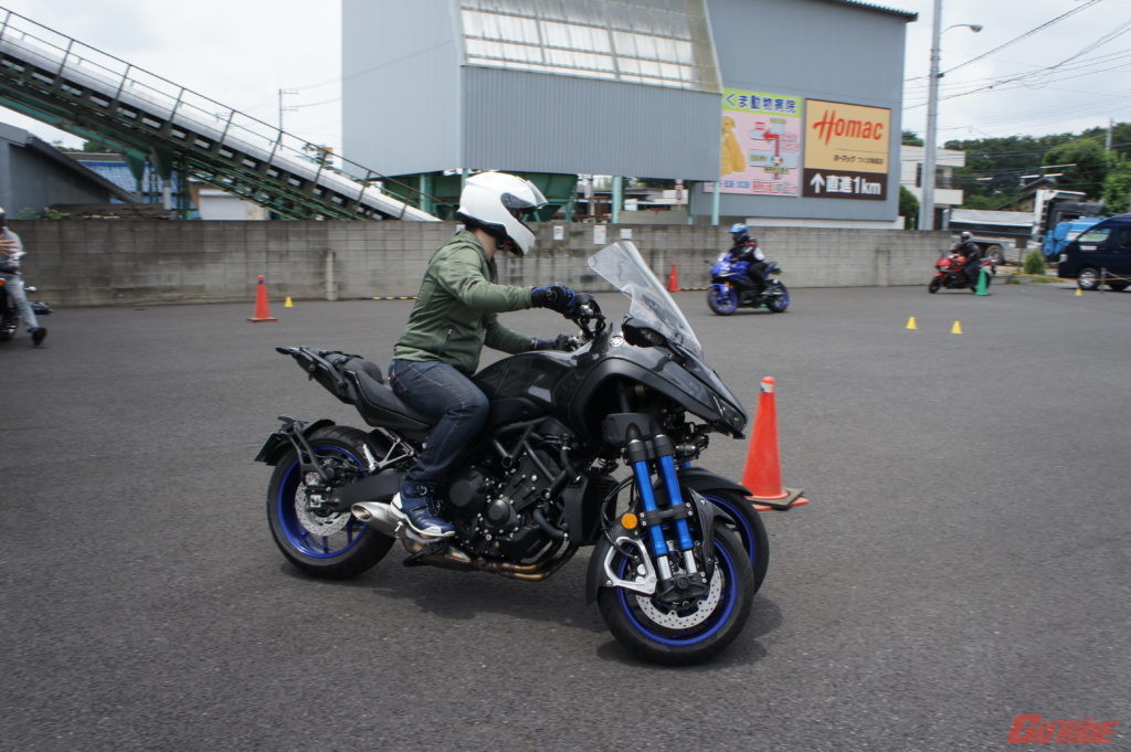 オフのメンバーは店舗常設のオフ会場で、基本テクニックとなる「走る、曲がる、止まる」を繰り返し、ビギナーが中心というオンでは店舗の駐車場を利用してパイロンをクリアしていくスクールを実践していた。
