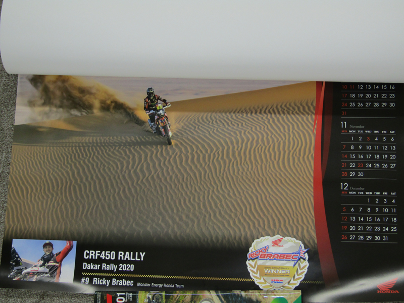 ホンダモーターサイクルレーシングカレンダー2021です。それぞれのレースジャンルのシーンごとに分かれていて、最後にダカールラリー CRF450 RALLYです。カッコイイですね!