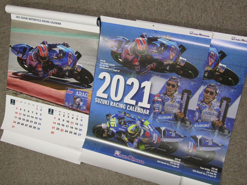 続いてスズキレーシングカレンダー2021です。こちらもそれぞれのレースジャンルのシーンと契約選手の走行シーンなどとなっています。でもなんといっても昨年のスズキはMotoGP年間チャンピオン獲得したことですよね! それではご応募をお待ちしております!