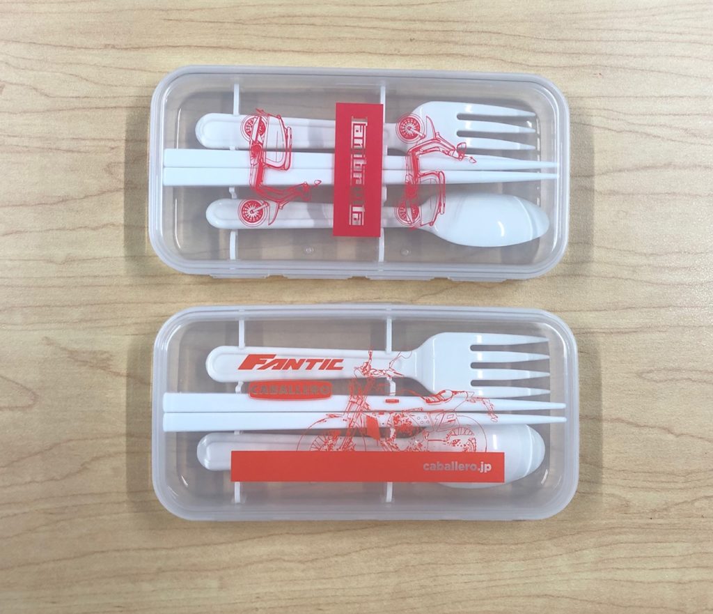 ランブレッタとファンティックのロゴ入りケースに入ったテーブルウエアセットです。