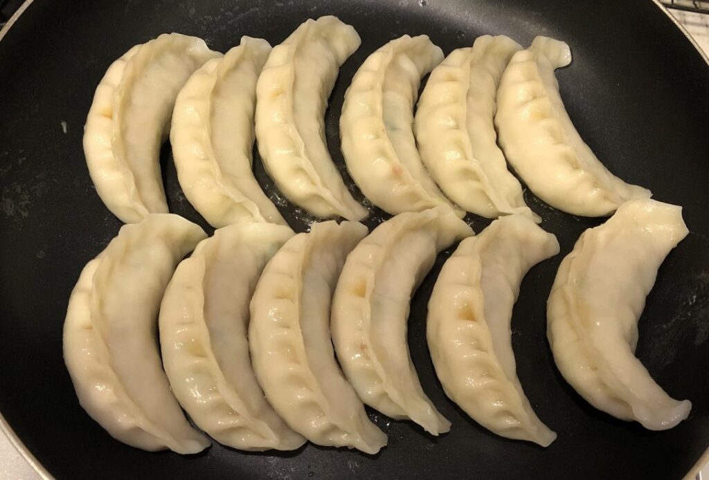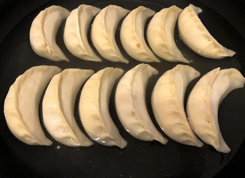 少し間隔を空けて餃子をフライパンに並べていきます。