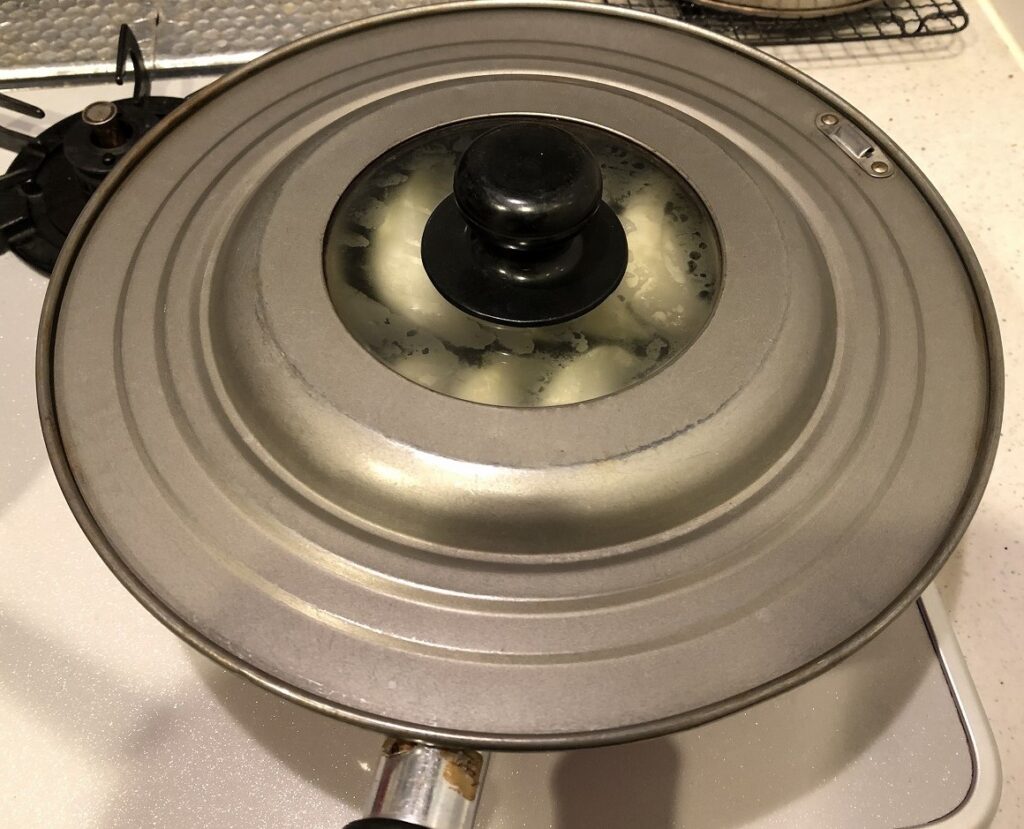 フライパンにフタをして、強火で7~8分ほど蒸し焼きにします。