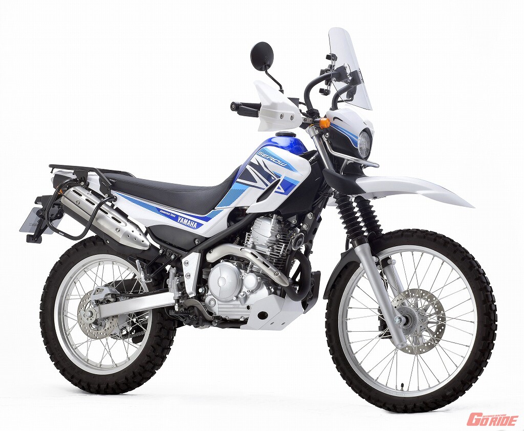 【トレンド&デモ車展示中】ダートフリーク社が提案する「セロー250ツーリング」などのデモマシンも店内展示中。また人気のアウトドアコーナーも商品を拡充中。