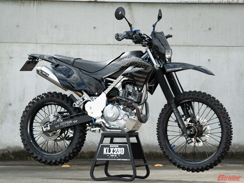 発売開始……すぐに課題が。カワサキのバイクショップのかたにいろいろ聞いて回ったところ、ふたつの課題が顕在化した。ひとつは「どうやってフロントマスクをカスタムするか」、もうひとつは「日本人の体形に合わない沈まない高い車高をどう下げるか」だった。そして結論も早かった。前者については「メーターなどの兼ね合いで簡単にマスクを変えることができない。または、まとまった資金を投じて変更するほどの車両ではない」、後者については「さまざまなパーツ類が干渉して、シートのアンコ抜きくらいしか対応ができない」と。愛知のオフロードの名門「ダートフリーク」社が製作したKLX230のコンプリートカスタム車がすべてを語っていた……原型がわからないほどの金額を投じる、だった。