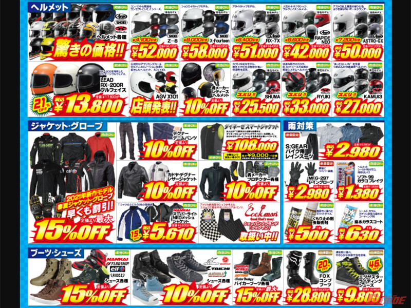 アライ・SHOEI・カブトなどの定番・人気ブランドのヘルメットが店舗限定・期間限定の値引き販売中。私たちはがんばっています。さらに、21年の最新モデルのジャケットやグローブもしっかり値引きセール中です。もちろん、ケミカル類などの消耗品も勝負価格に。消耗品は、いずれは使い切るので買いだめしておくのがお勧めです。