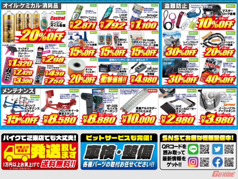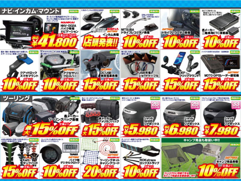 簡単にいいますと、展示・販売品が全般的にセールとなっています。バイクでのご来店場合は購入された商品を発送しますので、安心してツーリングの途中などでもお立ち寄りください。定番サービスの「ナンカイメイトポイントカード」のご利用で、さらにお得になりますのでW(ダブル)でお得な購入をこの機会にぜひ!!