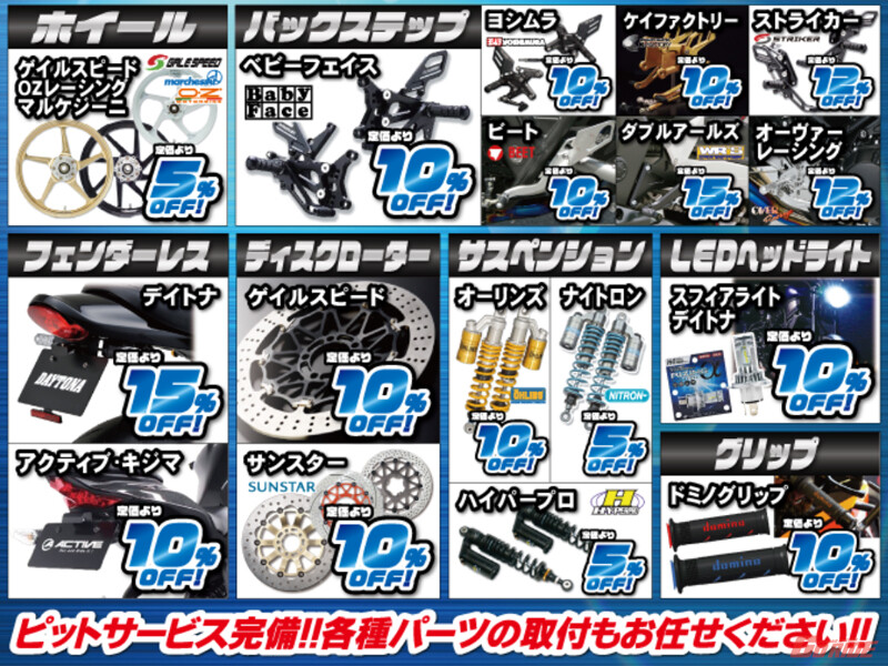 夏といえば誰が何といってもカスタムです。定番のヨシムラ、アクラボヴィッチ、SP忠男、モリワキ、ケイファクトリーなどの人気ブランドのアフターパーツ類がズラリラインナップ。マフラー、ホイール、バックステップ、サスペンションなども地域最大級の規模で多数展示&販売中です。もちろん店舗のためピットサービスを完備。なのでパーツの取り付けもお任せください。