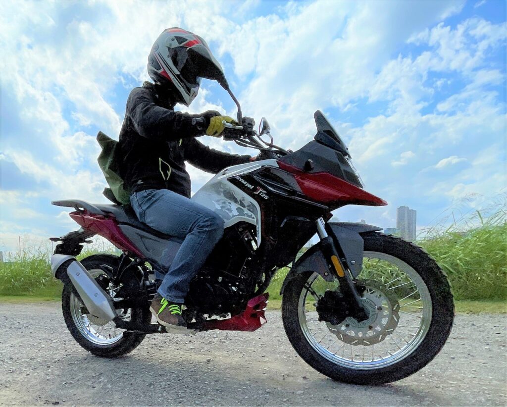 足着き性は片足つま先立ちとなりますが、車重はXEF250TRAILより8kgも軽い96kgなので、