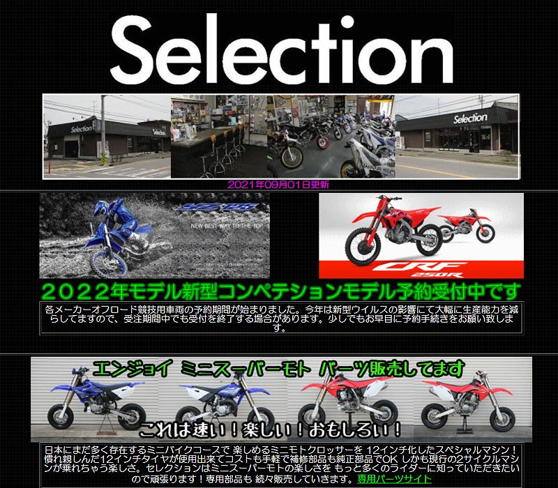 三重県鈴鹿市のホンダのド真ん前でオフロードバイクショップを運営する「セレクション」では、現在オフロードモデルの新車・中古車の販売はもちろん、モタードカスタムなど幅広いオフ車の楽しみかたを提供しています。