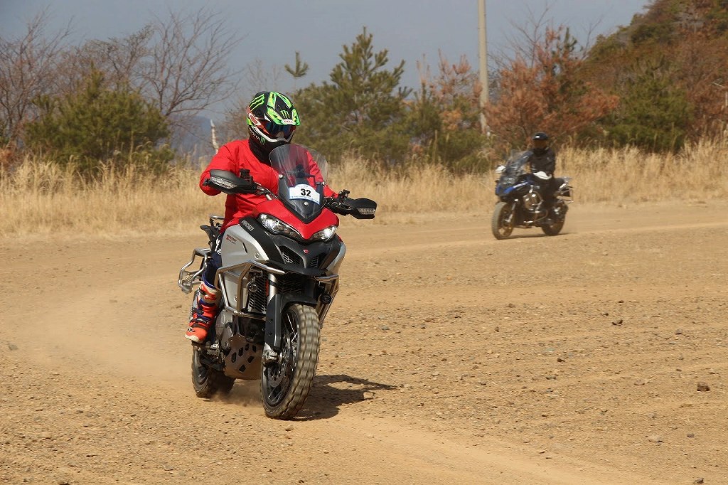 講師には4輪・2輪問わずラリーシーンで活躍する世界的なラリースト池町佳生氏を迎え、15名が参加した。会場はフラットダートなど初心者でも楽しめる湯浅トライアルパーク。同社ではドゥカティ正規代理店「DucatiKyoto」とBMW正規代理店「Motorrad Casuno」を運営していることもあり、BMW GSシリーズ、ドゥカティのムルティストラーダ、スクランブラーシリーズなどの参加者が多数で、それらが集まるだけでも壮観な光景だった。